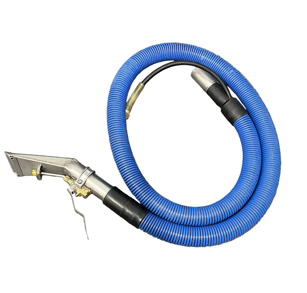 Professional stainless steel upholstery cleaning tool with 1.8 m (6 ft) internal solution hose, vacuum hose and external 02 spray tip.